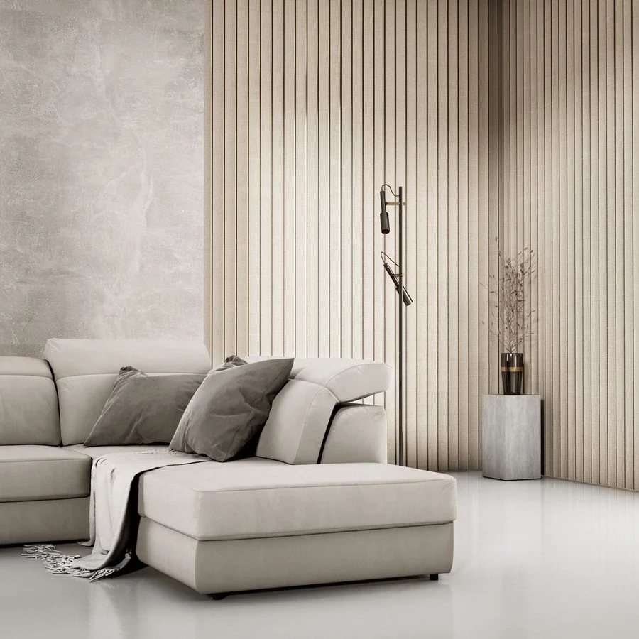 A falburkolat valódi különlegességét a markánsan szögletes, mégis letisztult lamellaprofil adja, amely karakteres, modern és elegáns megjelenést kölcsönöz bármely falnak. A függőlegesen futó, precízen megformált bordák nem csupán struktúrát teremtenek, hanem harmonikus, rendezett ritmust visznek a térbe, amely vizuálisan megnyújtja a falakat és tágasabb érzetet biztosít. Ez a hatás különösen értékes olyan helyiségekben, ahol alacsonyabb a belmagasság, hiszen a lamellák iránya finoman felfelé vezeti a tekintetet, így optikailag magasítja a teret.